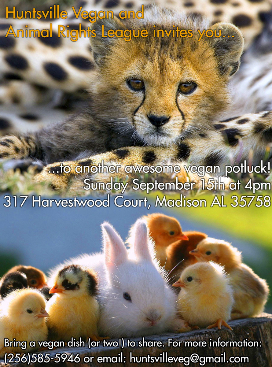 Huntsville Vegan and Animal Rights League is having its September potluck at Jamie’s house in Madison [317 Harvestwood Court, Madison AL 35758]! Bring a dish or two, no particular theme– whatever you think would be enjoyable.
